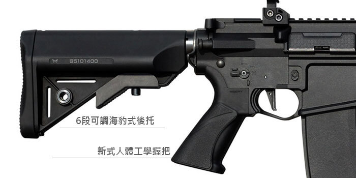 人體工學設計的6段可調海豹式後托及握把。